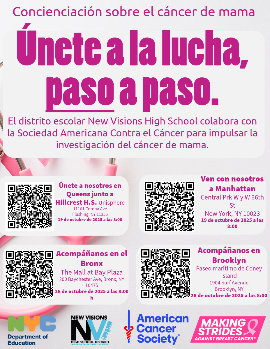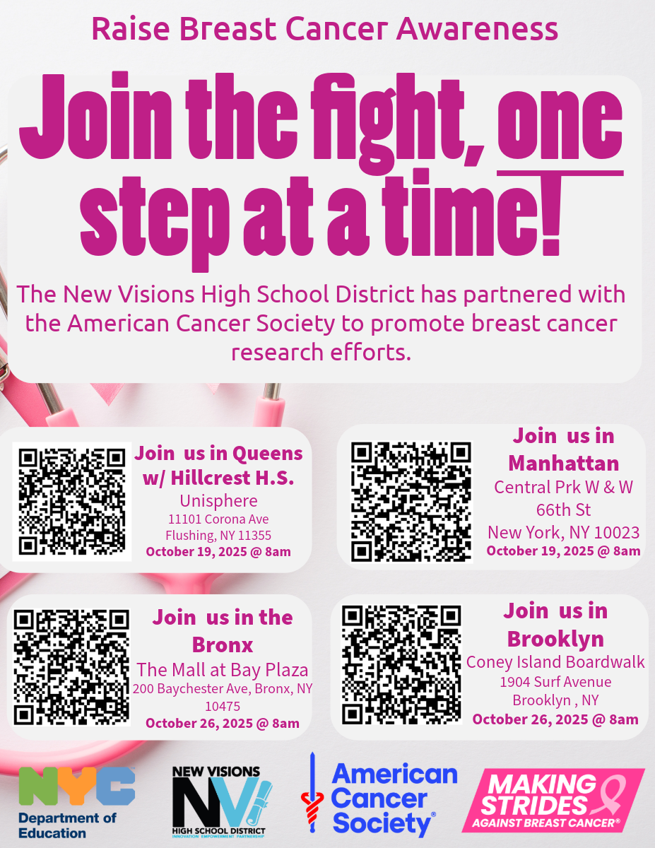 The New Visions High School District has partnered with the American Cancer Society to promote breast cancer research efforts, we encourage you to join our borough walks. Please see flyer for details.