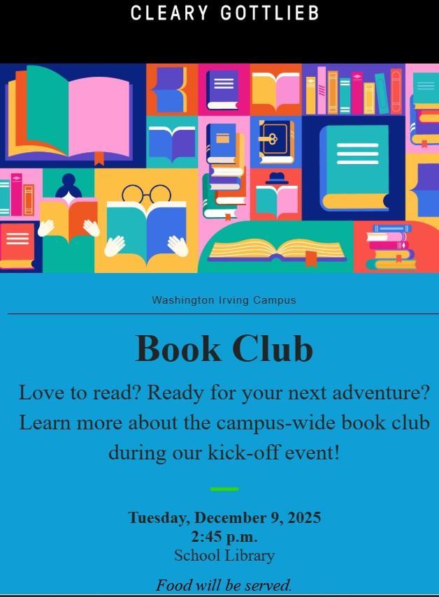 Book Club Tuesday, December 9, 20252:45 p.m.School Library Food will be served. Any questions, speak with Tracy Karas, Library Media Specialist, [email protected]