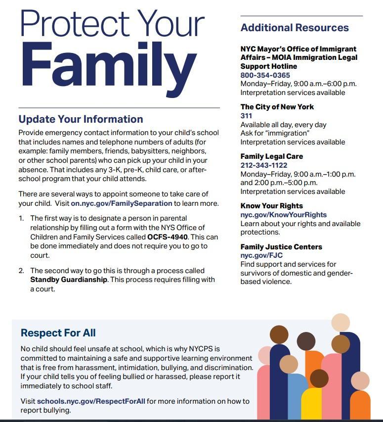 Please see attached flyer for guidance on your rights and how to protect your family. If you or a loved one needs immigration legal assistance, call the free legal hotline at 800-354-0365 or 311 and say “immigration legal assistance”. The hotline is available to take calls in multiple languages.